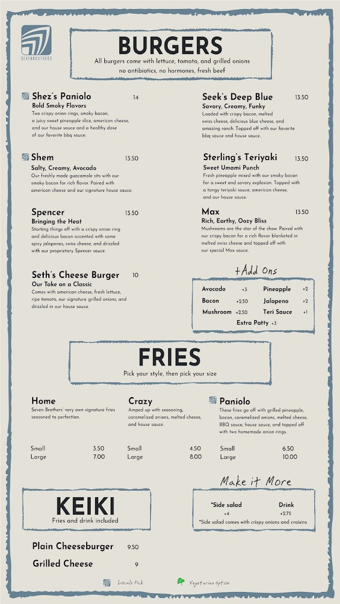 The highlight of Seven Brothers is undoubtedly its mouthwatering burgers. Patrons like Lei Fesaitu express sheer joy with each bite, describing their experience as a “happy dance in your chair.” The burgers are juicy, flavorful, and satisfyingly messy, a true burger lover's dream. Burgers such as the tantalizing Deep Blue Burger and the intriguing Shem Burger come highly recommended for their perfectly cooked patties and sensational toppings.